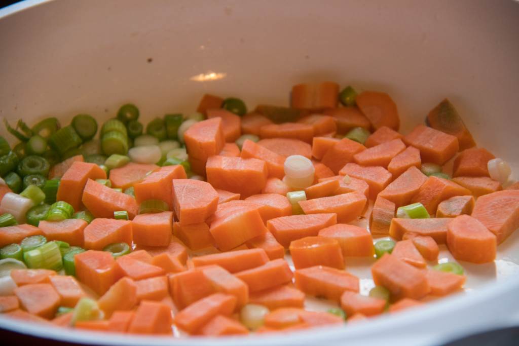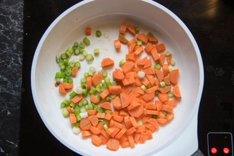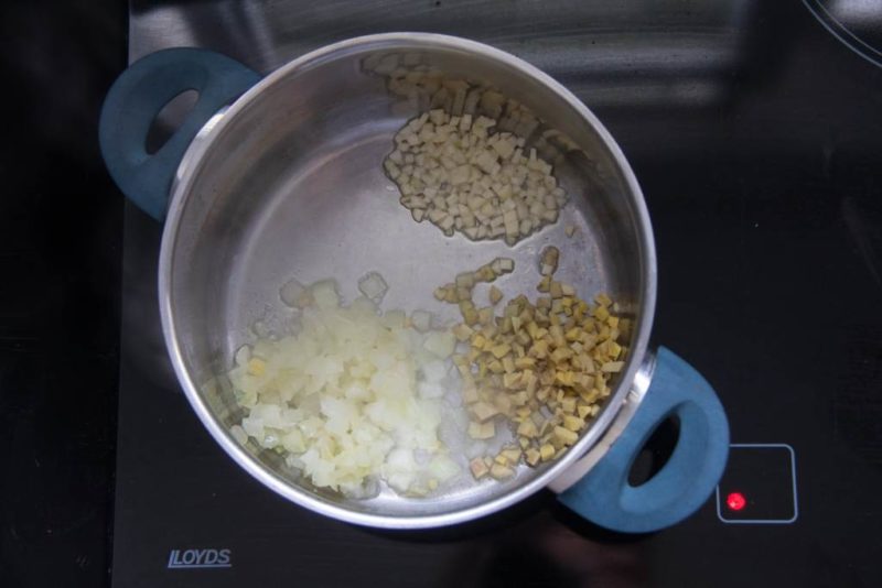 Zwiebeln, Ingwer und Knoblauch in einen Topf geben… …und anrösten lassen - Gib die restliche Gemüsebrühe und die Soja-Sauce dazu, rühre kurz um und lasse sie aufkochen, regele die Hitze auf dann niedrige Stufe zurück
