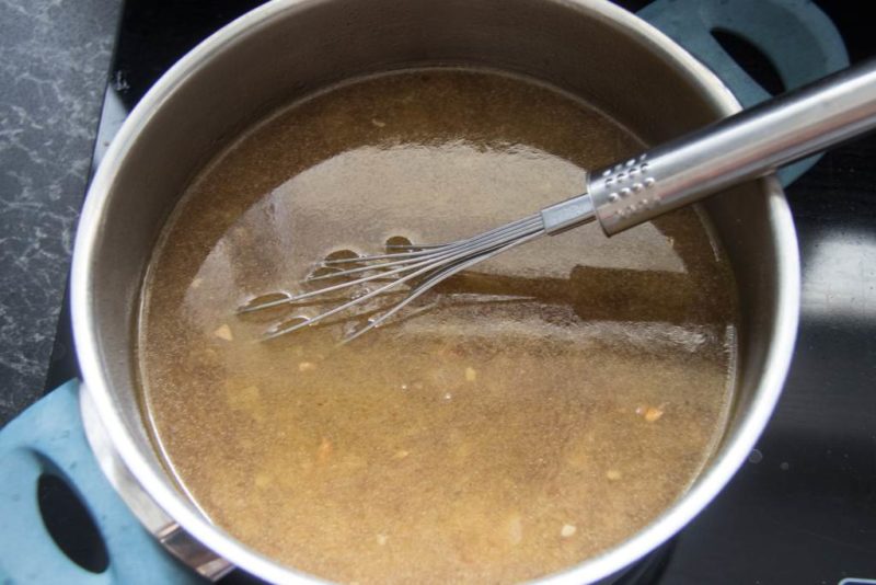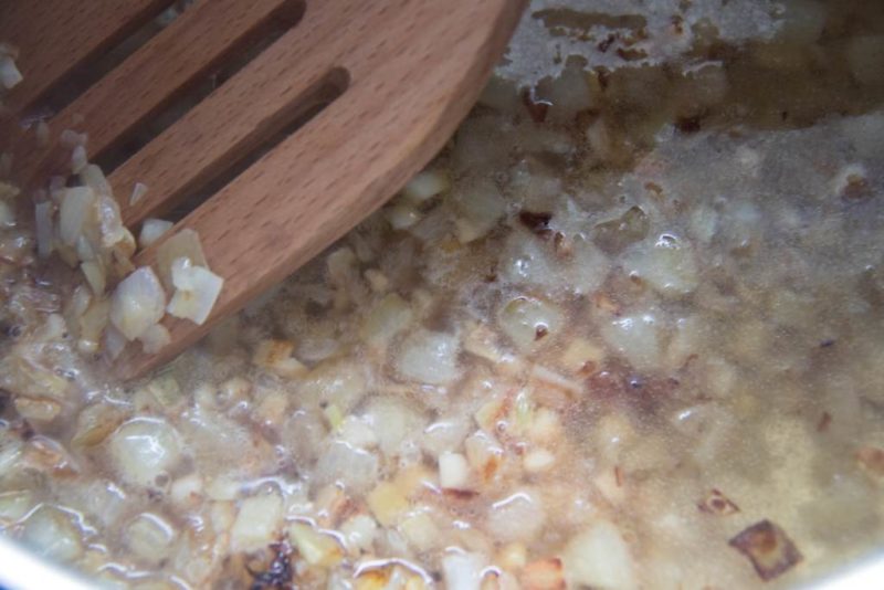 - Lösche alles nun mit etwa einer Tasse Gemüsebrühe ab. Dann schabe alle Röststoffe, die sich auf dem Boden des Topfes abgesetzt haben, gründlich ab (wichtig, um nachher den intensiven Geschmack zu bekommen!)