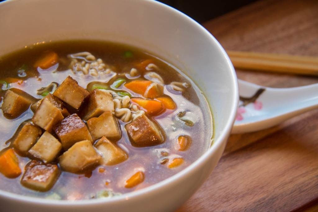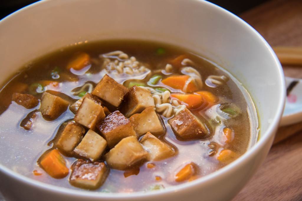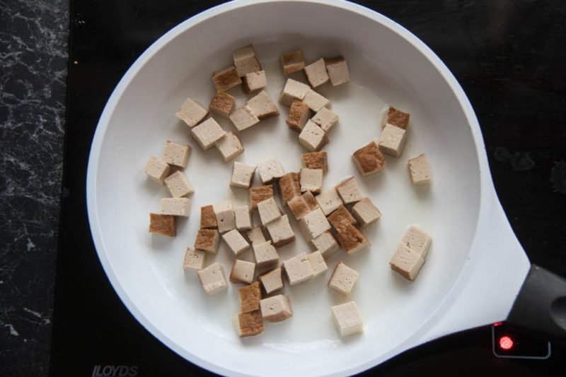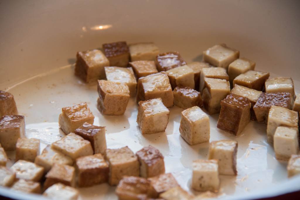 Tofu anbraten - Optional kannst du die Brühe durch ein Sieb abgießen, ich mag die Einlage aber gerne mitessen 😉