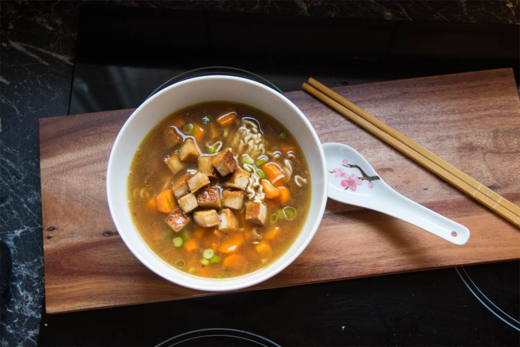 Mit “Ramen” werden eigentlich die speziellen Nudeln bezeichnet, aber auch das Gericht an sich, die Suppe, wird Ramen genannt. Basis bildet die verwendete Brühe, die aus Hühner-, Rinder-, Fisch-, Gemüsefond oder eben wie in diesem Rezept hier, mit Miso-Paste zubereitet wird. Als Topping werden dann die verschiedensten Beilagen wie Gemüse, Fleisch oder auch Tofu hinzugegeben. Ramen zeichnen sich durch einen besonders intensiven “Umami”-Geschmack aus. Sie gelten als wärmendes und stärkendes Gericht – ich kann das nur bestätigen, nach dem Genuss fühlt man sich ganz wohlig 😉
