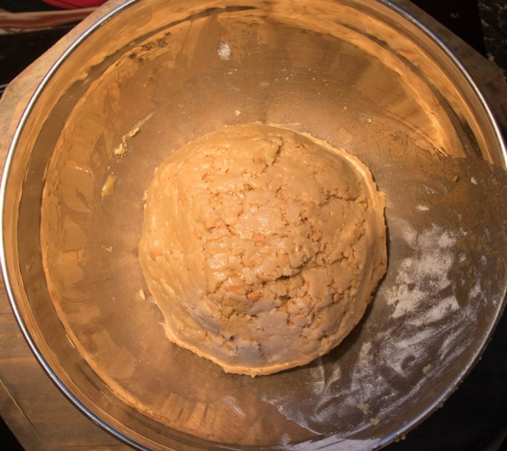 - Alle Zutaten bis auf 1/4 der gehackten Erdnüsse in die Küchenmaschine geben und zu einem homogenen Teig verkneten lassen.