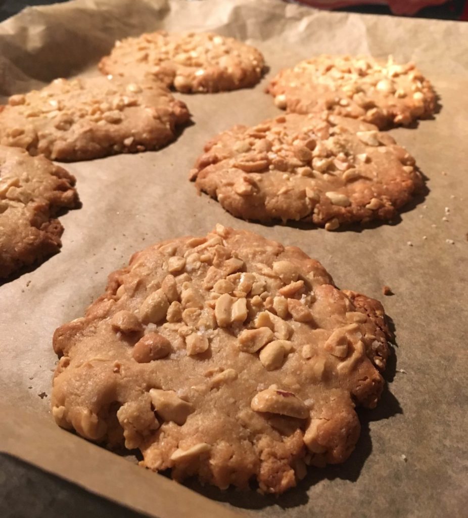 - Wenn alle Cookies auf dem Backblech sind, die restlichen gehackten Erdnüsse gleichmäßig verteilen und jeden Cookie mit etwas Fleur de Sel bestreuen.