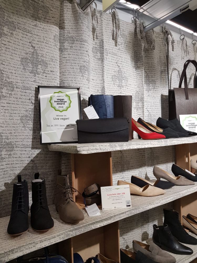 Vegane Schuhe sind für mich ehrlich gesagt noch Neuland, trotzdem oder gerade deshalb habe ich mich am Stand von Noah einmal genauer umgeschaut. Dort gibt es wirklich schön geschnittene Schuhe für Damen und Herren, aus Microfaser gefertigt, die einmal wie Wildleder (“Micro-Suede”) oder wie Glattleder (“Micro-Nappa”) aufgearbeitet wird. Das Material fühlt sich wirklich edel an und steht meiner Meinung nach “echtem” Leder in nichts nach. Doch bei Noah gibt es nicht nur Schuhe, sondern auch Gürtel und Taschen. Mit ihrem Material aus millimeterdünnem veredelten Holz hat die Tasche “Silva” sogar den Vegan Innovation Award 2018 in der Kategorie “Live Vegan!” gewonnen. Herzlichen Glückwunsch 🙂 Mehr Infos und einen Onlineshop gibt es auf noah-shop.com