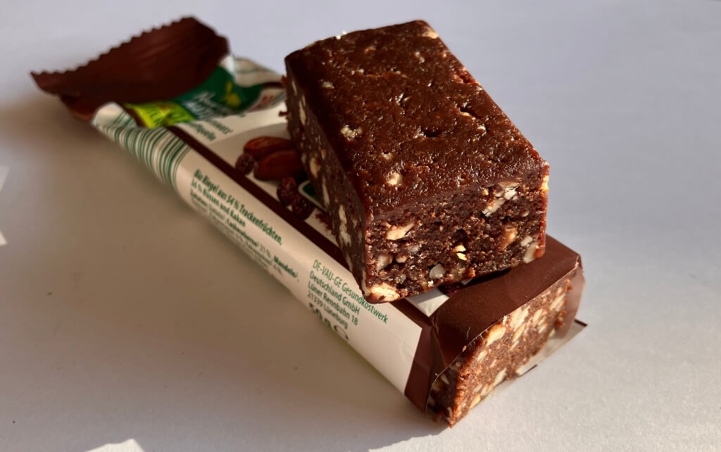 Bio-Riegel aus 54% Trockenfrüchten, 36% Nüssen und Kakao