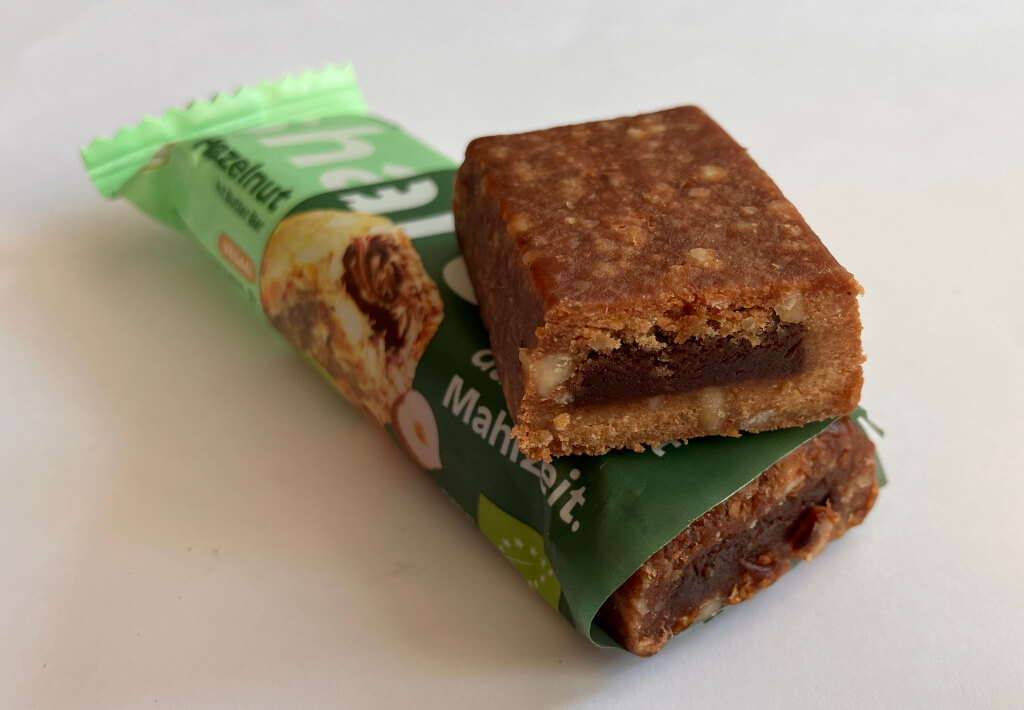 Bio-Dattelriegel mit Haselnüssen und Haselnussmus.