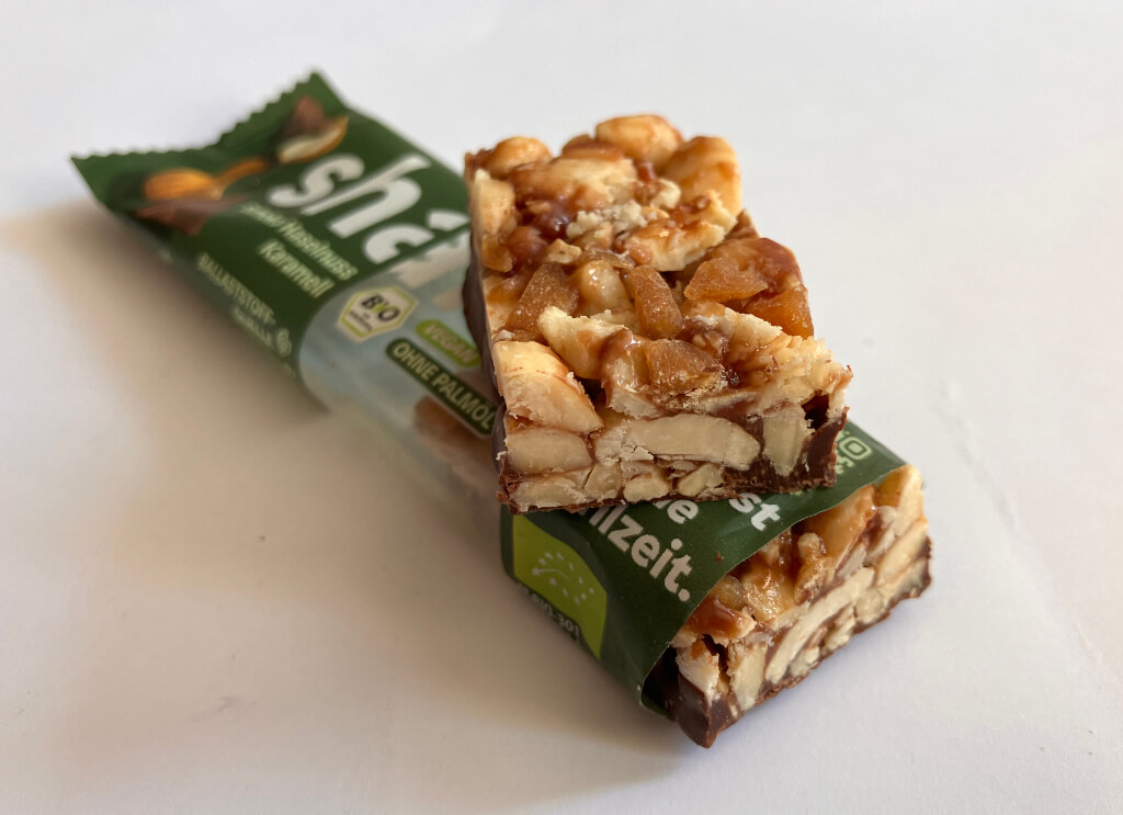Bio-Riegel mit Haselnüssen, Cashewkernen, Karamellstücken und Schokolade.